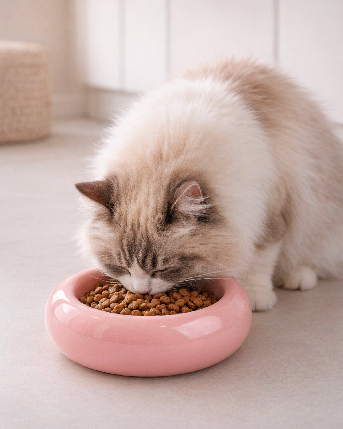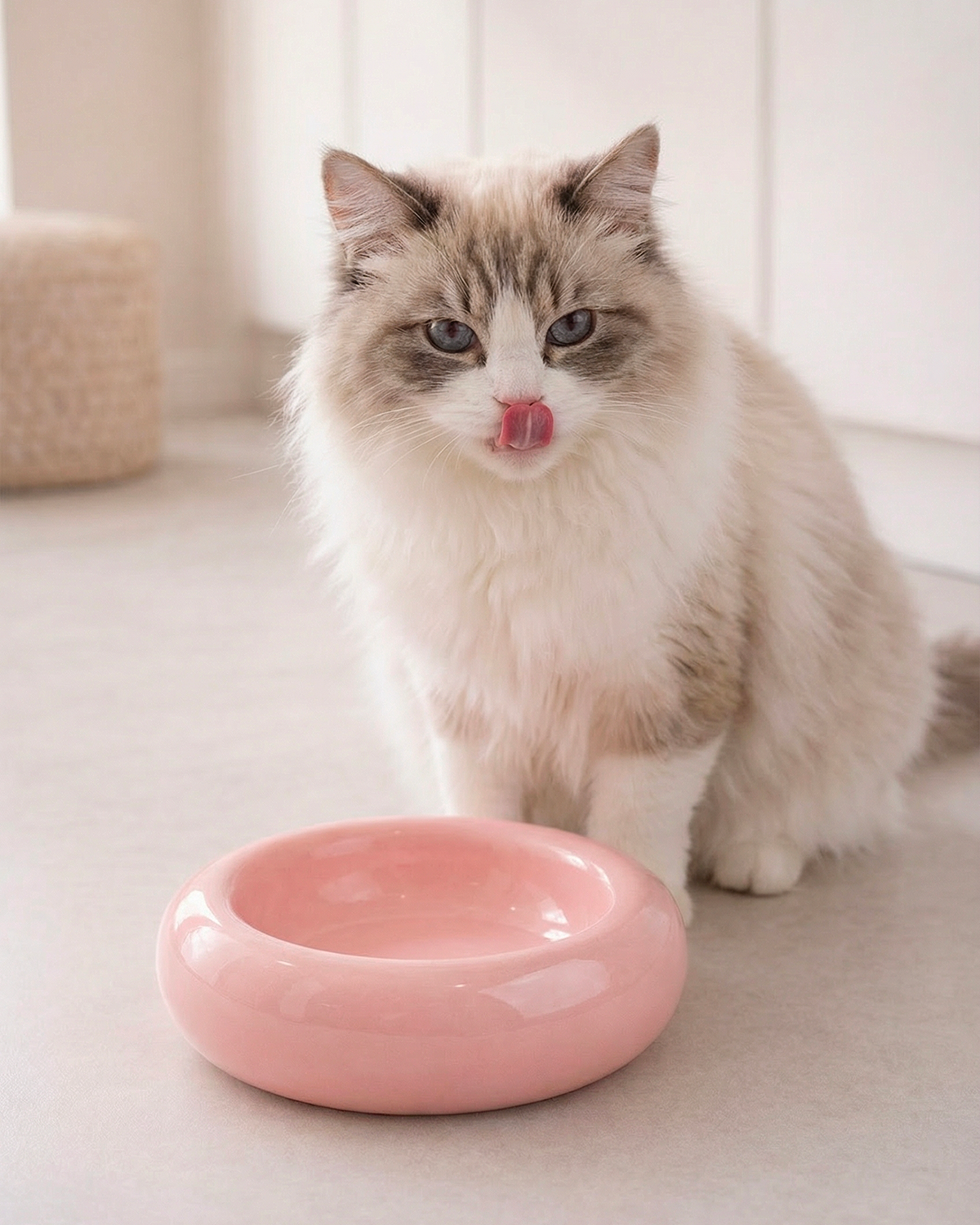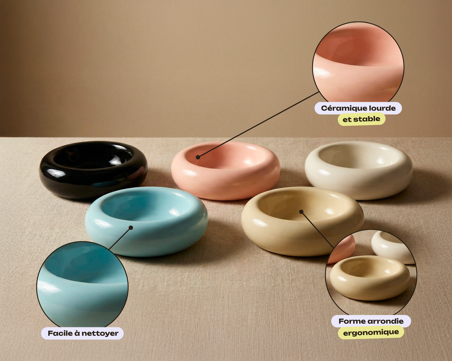 La CozyBowl est une gamelle en céramique arrondie, conçue pour offrir à votre chat une expérience de repas hygiénique, sûre et agréable.