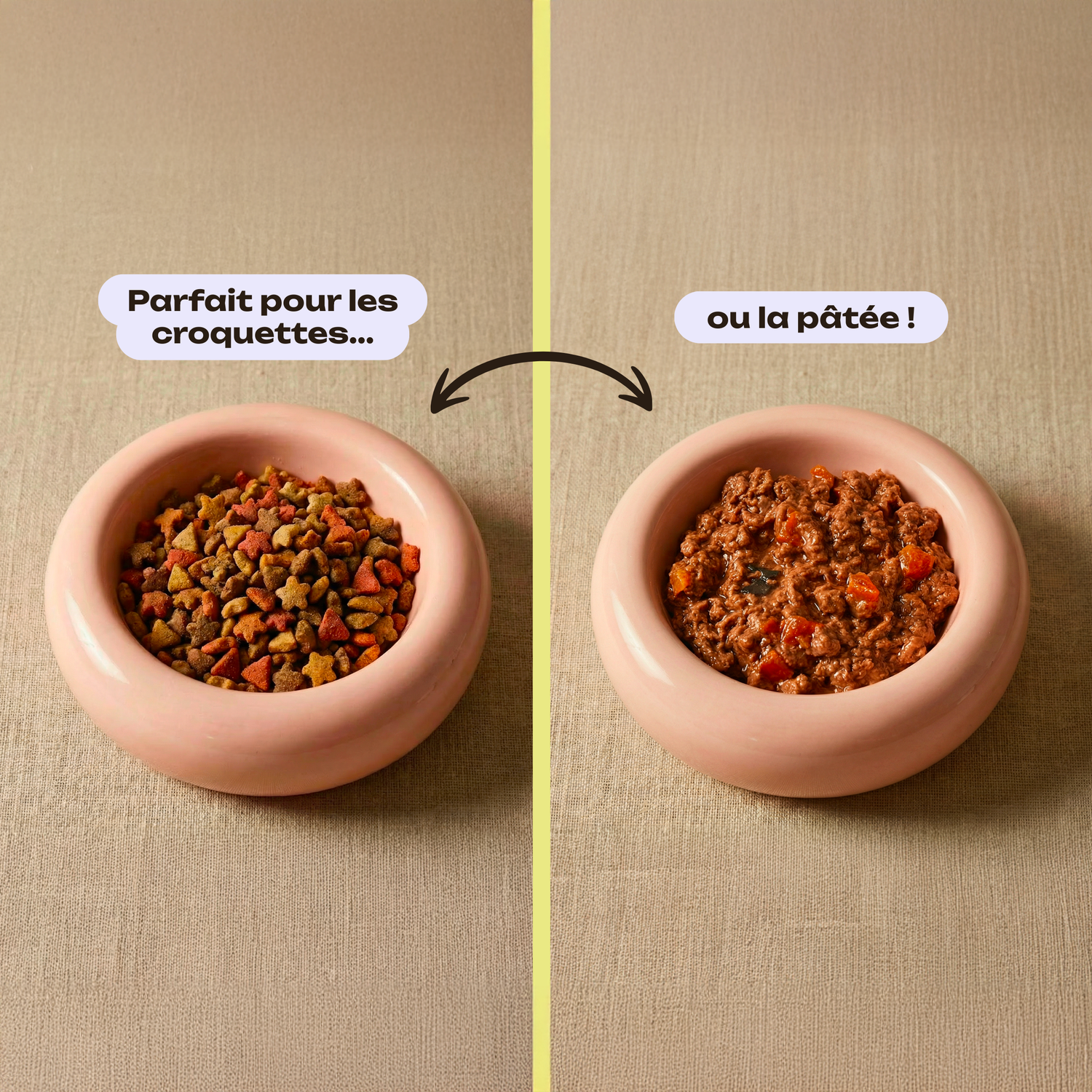 Son design arrondi permet au chat d’accéder facilement à sa nourriture ou à son eau, limitant la fatigue des moustaches (“whisker fatigue”) et améliorant le confort pendant les repas.